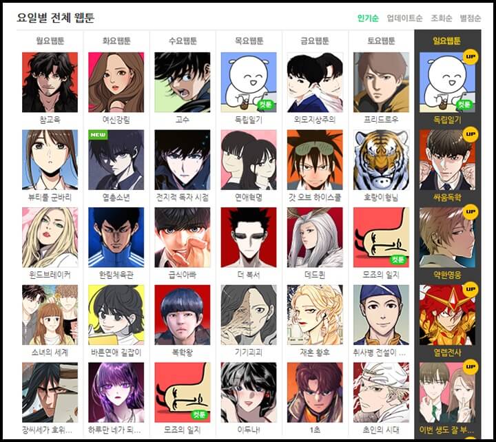 네이버 웹툰 주소(comic.naver.com/index.nhn)를 검색하시면 쉽게 접속이 가능합니다. 요일별로 만화가 잘 정리되어 있고 인기 순위별이나 추천시스템으로 좋아하는 장르나 비슷한 장르를 추천해주기 때문에 시간가는 줄 모르고 사용하기 좋습니다.