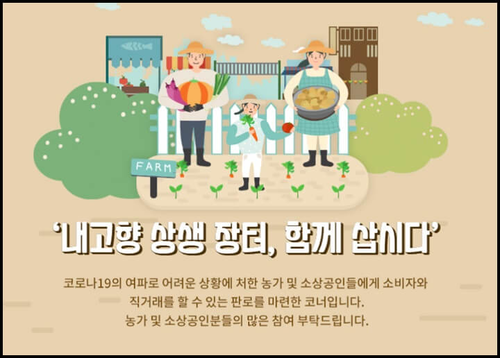 안녕하세요. 오늘은 6시 내고향 상생장터 홈페이지에 대해서 알아보겠습니다. 6시 내고향 상생장터는 코로나 19로 인해서 많이 힘든 농가와 소상공인들을 위해서 소비자와 직거래를 할 수 있도록 만든 웹사이트입니다. 많은 분들이 질 좋은 상품을 싸게 직거래로 받아갈 수 있는 장소이니 많이 찾아 주시면 좋을 것 같습니다.